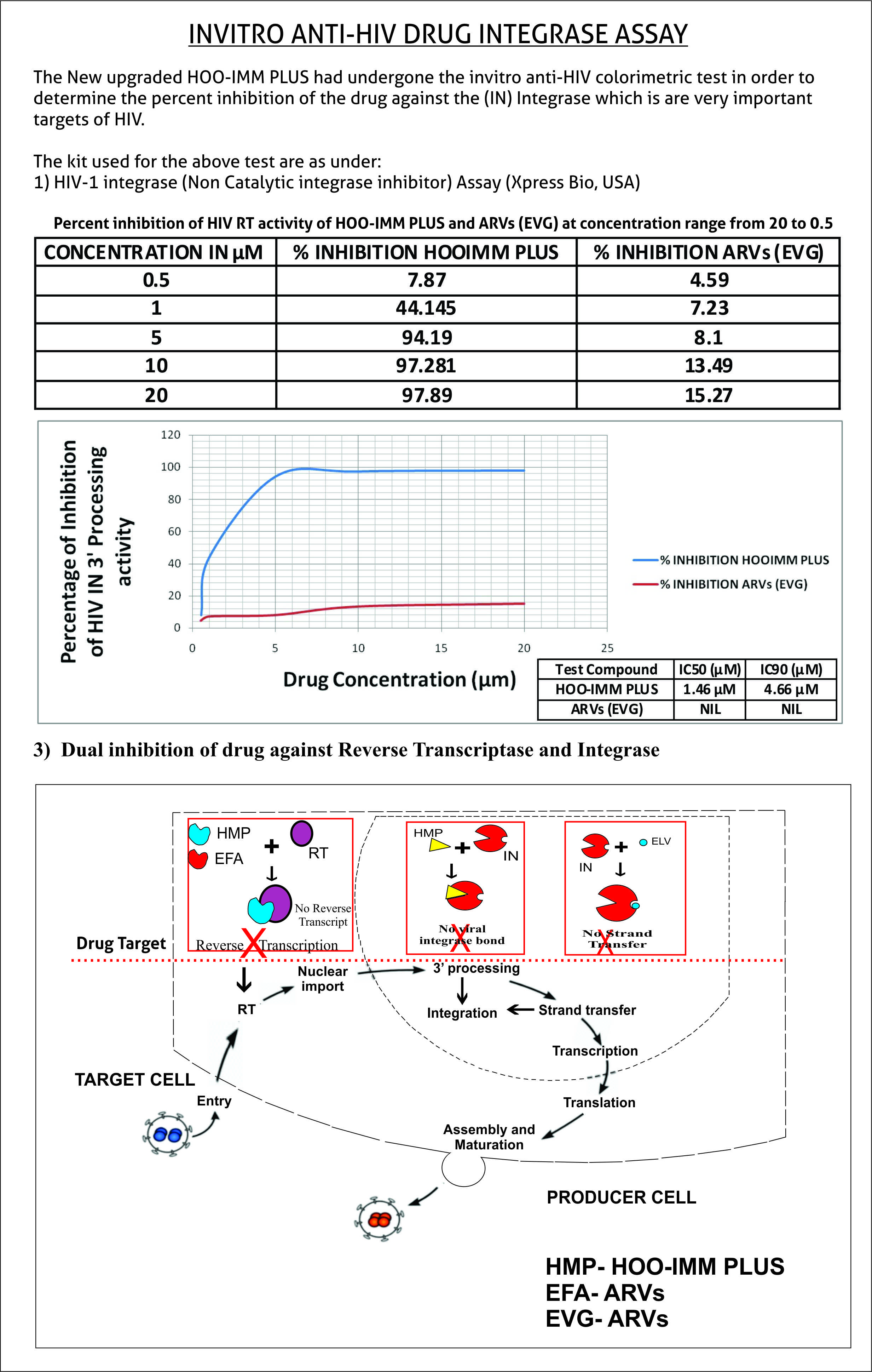 The New upgraded HOO-IMM PLUS had undergone the invitro anti-HIV colorimetric test in order to determine the percent inhibition of the drug against the (IN) Integrase that is very important target of HIV.