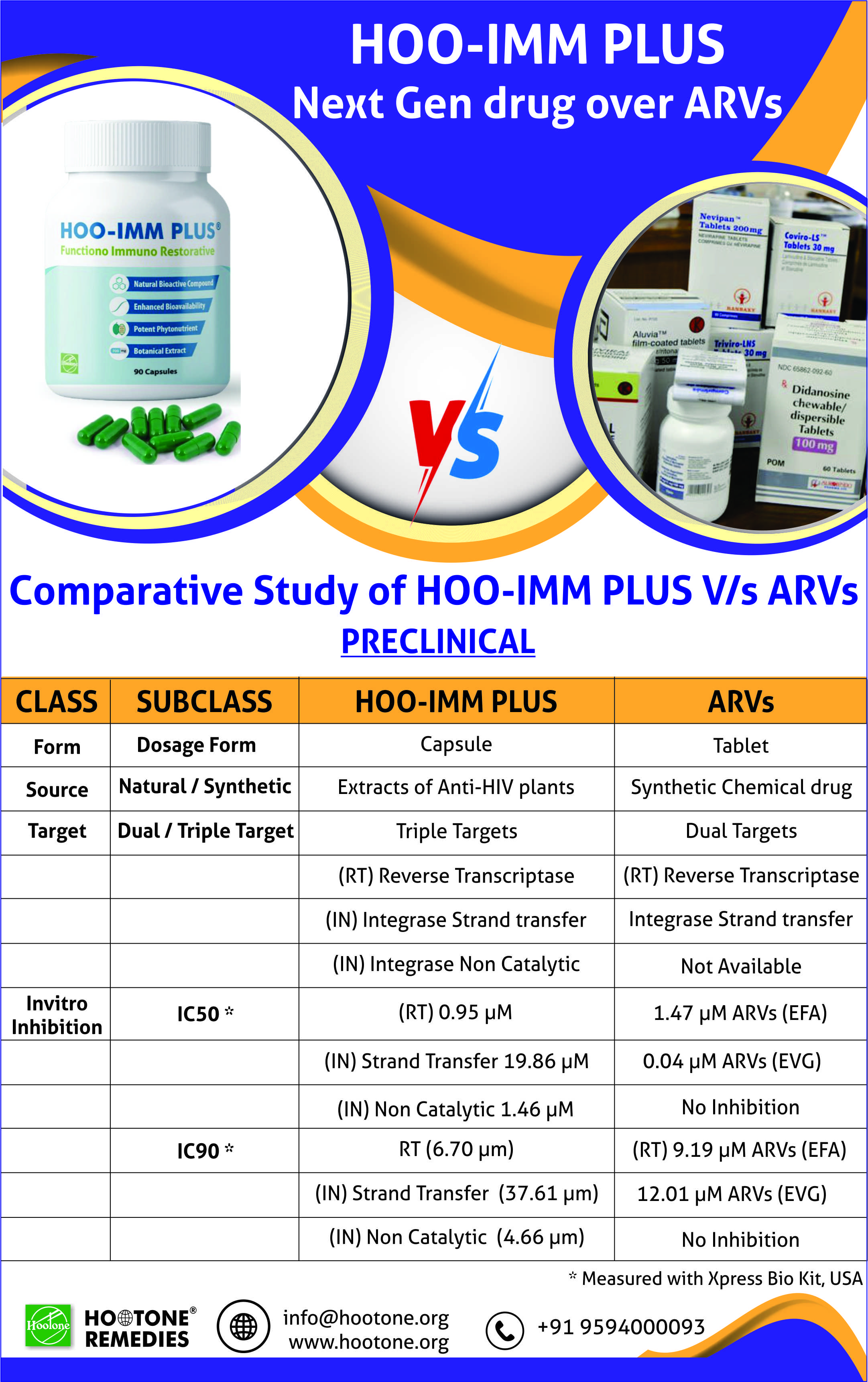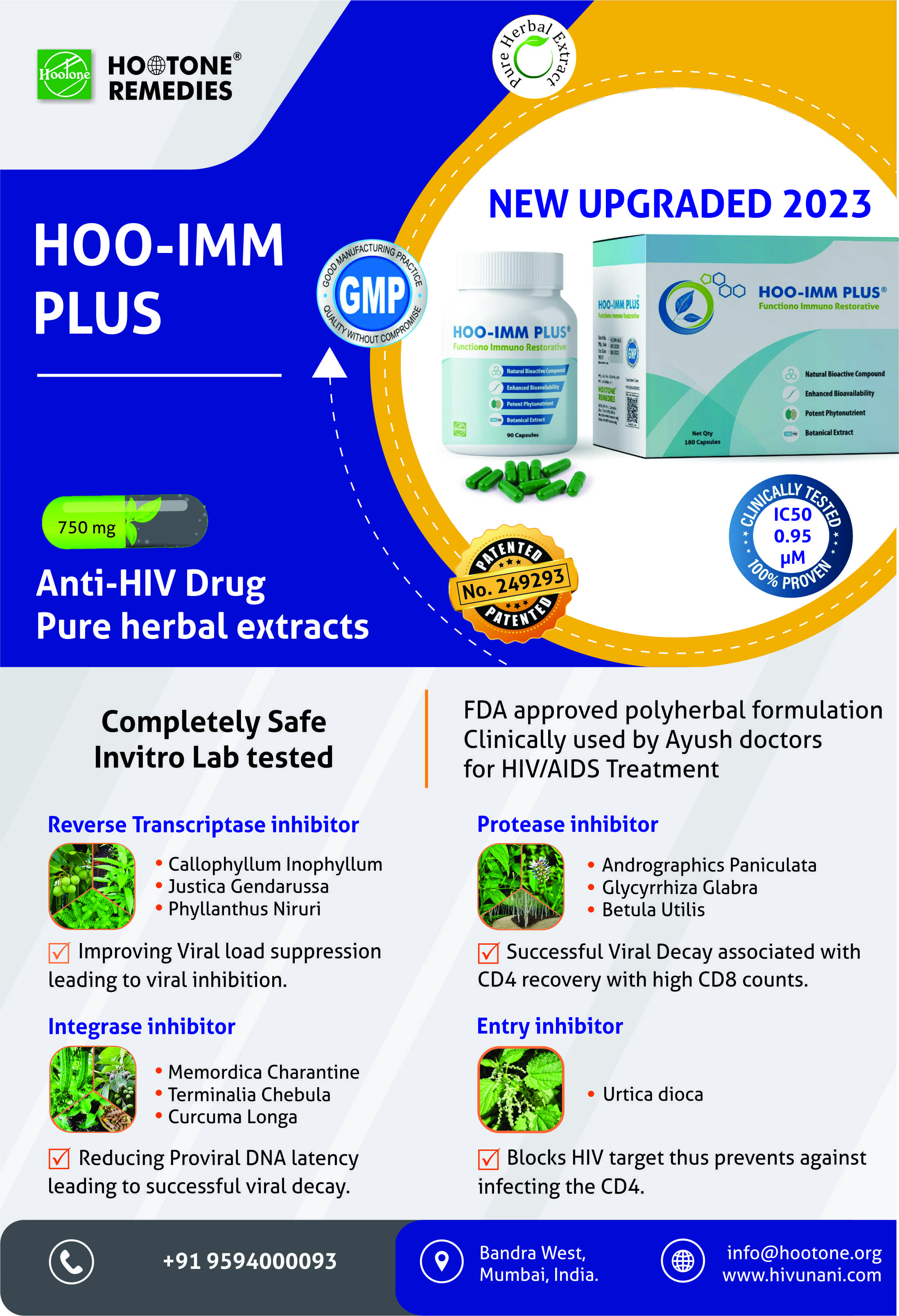 HOO-IMM PLUS, a plant based dual target HIV drug, works by inhibiting 2 different enzymes that are critical for HIV replication; (IN) Integrase & (RT) Reverse Transcriptase, thus prevent the virus from replicating and spreading throughout the body and reduce the risk of drug resistance that overall improves the treatment outcome.