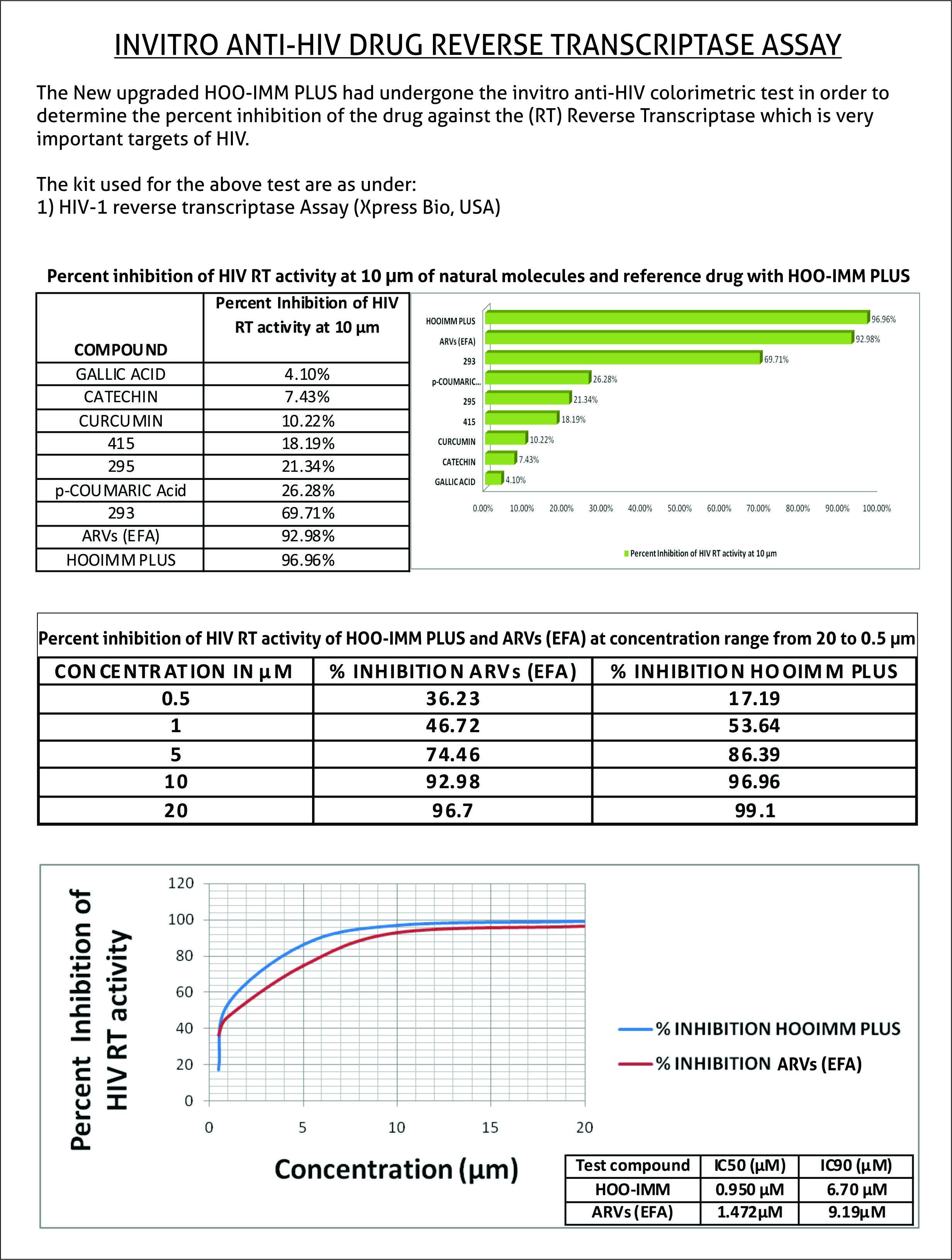 The New upgraded HOO-IMM PLUS had undergone the invitro anti-HIV colorimetric test in order to determine the percent inhibition of the drug against the (RT) Reverse Transcriptase that is very important target of HIV.